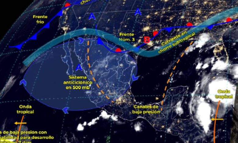A su vez, el ingreso de humedad del Océano Pacífico, propiciará chubascos y lluvias puntuales fuertes en el occidente y sur del territorio nacional, además de lluvias aisladas en zonas del centro y oriente de la República Mexicana. Finalmente, una circulación anticiclónica en niveles medios de la atmósfera, mantendrá ambiente caluroso a muy caluroso en la mayor parte del territorio mexicano.