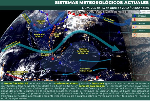 Este día, el frente frío Núm. 42 se extenderá sobre el norte de México e interaccionará con la corriente en chorro y con una línea seca sobre el noreste del país; a su vez, un canal de baja presión sobre la vertiente del Golfo de México y el ingreso de humedad proveniente del Océano Pacífico y Mar Caribe, originarán lluvias puntuales fuertes en Oaxaca y Chiapas, así como lluvias y chubascos en zonas del oriente y sureste de la República Mexicana, incluida la Península de Yucatán, todas las lluvias con descargas eléctricas.
