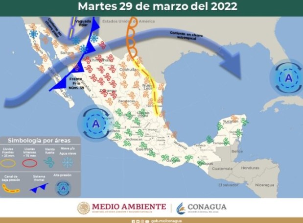 Por otra parte, el frente frío Núm. 39 y el vórtice de núcleo frío recorrerán el noroeste y norte de México, provocando lluvias e intervalos de chubascos con descargas eléctricas, ambiente muy frío y vientos fuertes a intensos con tolvaneras en el noroeste y norte del territorio nacional, además, se mantendrá la probabilidad de caída de nieve o aguanieve en las sierras de Baja California, Sonora y Chihuahua hasta el mediodía.
