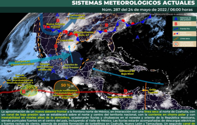 Por otra parte, un segundo canal de baja presión en el sureste de México, en combinación con el ingreso de humedad del Océano Pacífico y Golfo de México, originará lluvias puntuales muy fuertes con descargas eléctricas y posible caída de granizo en Chiapas y lluvias fuertes en Guerrero y Oaxaca.