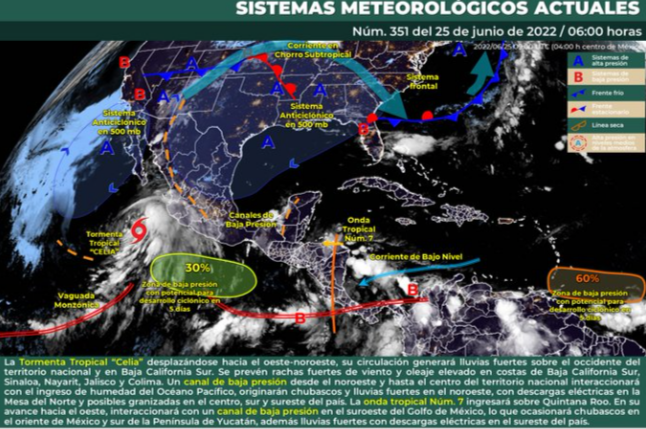 Por otra parte, un canal de baja presión que se extenderá desde el noroeste hasta el centro del territorio nacional y su interacción con el ingreso de humedad del Océano Pacífico favorecido por la circulación de “Celia”, originarán chubascos y lluvias puntuales fuertes en el noroeste, acompañadas de descargas eléctricas en los estados de la Mesa del Norte, además de posibles granizadas en el centro, sur y sureste del país.