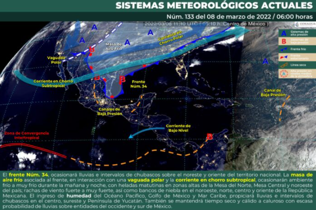 Así lo dio a conocer el Servicio Meteorológico Nacional (SMN), agrega que durante este día el Frente No. 34 se extenderá con características de estacionario sobre el occidente del Golfo de México, así como sobre el noreste y oriente del territorio nacional, ocasionará lluvias e intervalos de chubascos en dichas regiones.