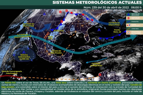 Por otro lado, canales de baja presión, uno extendido sobre el interior del país y otro en el sureste del territorio, en interacción con la entrada de humedad del Golfo de México y Mar Caribe y con inestabilidad en niveles altos de la atmósfera, originarán lluvias puntuales fuertes con descargas eléctricas en la Península de Yucatán.