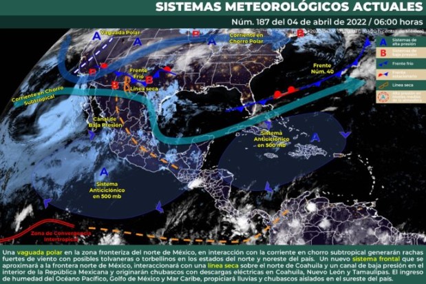Por otro lado, una vaguada polar que recorrerá la zona fronteriza del norte de México, en interacción con la corriente en chorro subtropical generarán rachas fuertes de viento con posibles tolvaneras o torbellinos en los estados del norte y noreste del país.