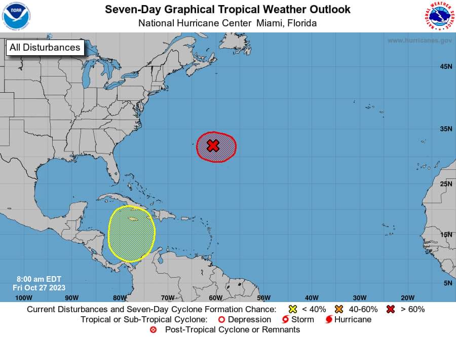 Además, destacó la situación en el Océano Atlántico, donde una zona de baja presión asociada a los remanentes del huracán Tammy se encuentra al sureste de Bermuda.
