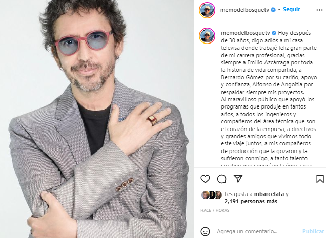PODER Y CRÍTICA | REDACCIÓN | Memo del Bosque anunció su salida de Televisa a través de un comunicado emitido por redes sociales a pesar de que la información fue compartida en primera instancia por una serie de comunicadores que trabajaron con él en la televisora de San Ángel.
