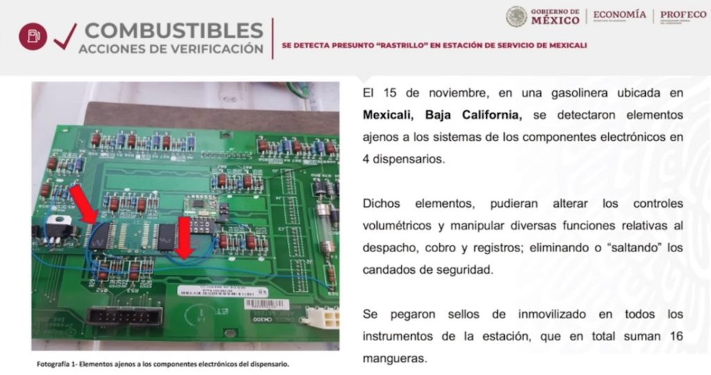 México, 27 de enero; poderycritica.-Las verificaciones realizadas en las expendedoras de energéticos en el país reportaron un nuevo “rastrillo” en la localidad de Gómez Palacio en el estado de Durango. El 22 de enero la Profeco identificó un artefacto con forma de insecto en dos bombas que retenían entre el 16 y 17 por ciento de cada litro, por lo que se presentó una denuncia formal.