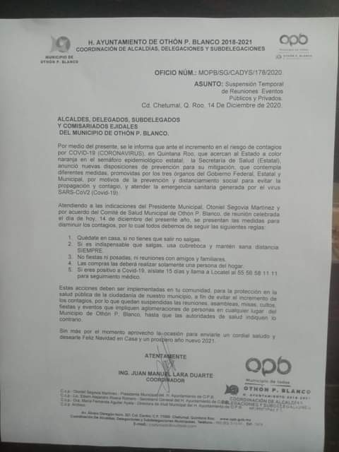 En el oficio marcado con el número MOPB/SG/CADYS/178/2020, fechado el lunes 14 de diciembre, el gobierno municipal notificó a los alcaldes, delegados, subdelegados y comisariados ejidales, sobre esta disposición.