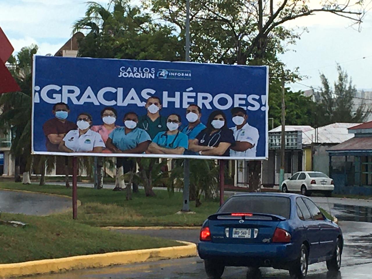 Por ejemplo en Chetumal las principales avenidas como la Insurgente, Bahía de Chetumal, la Héroes, la Andrés Quintana Roo, la Juárez, entre otras tienen el anuncio del 4to. Informe de Gobierno donde principalmente se promocionan las atrocidades realizadas por la crisis de salud provocada por el Covid-19.