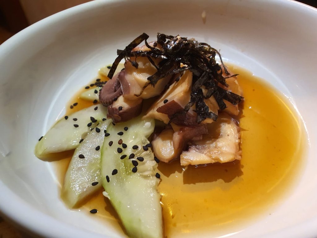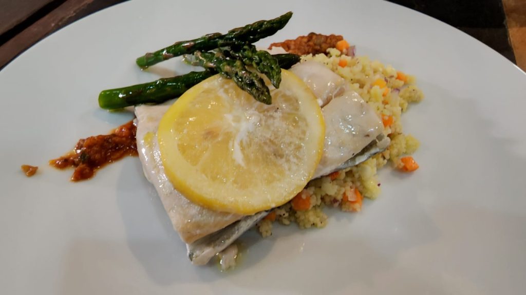 “Suinomono de pulpo maya y pepino”, “Filete de lobina estilo mediterráneo con aceitunas y alcaparras” y “Mango, mango, mango” fueron los platillos de la noche maridados con un vino Sauvignon blanc de Cava Quintanilla, vinícola de San Luis Potosí, México.