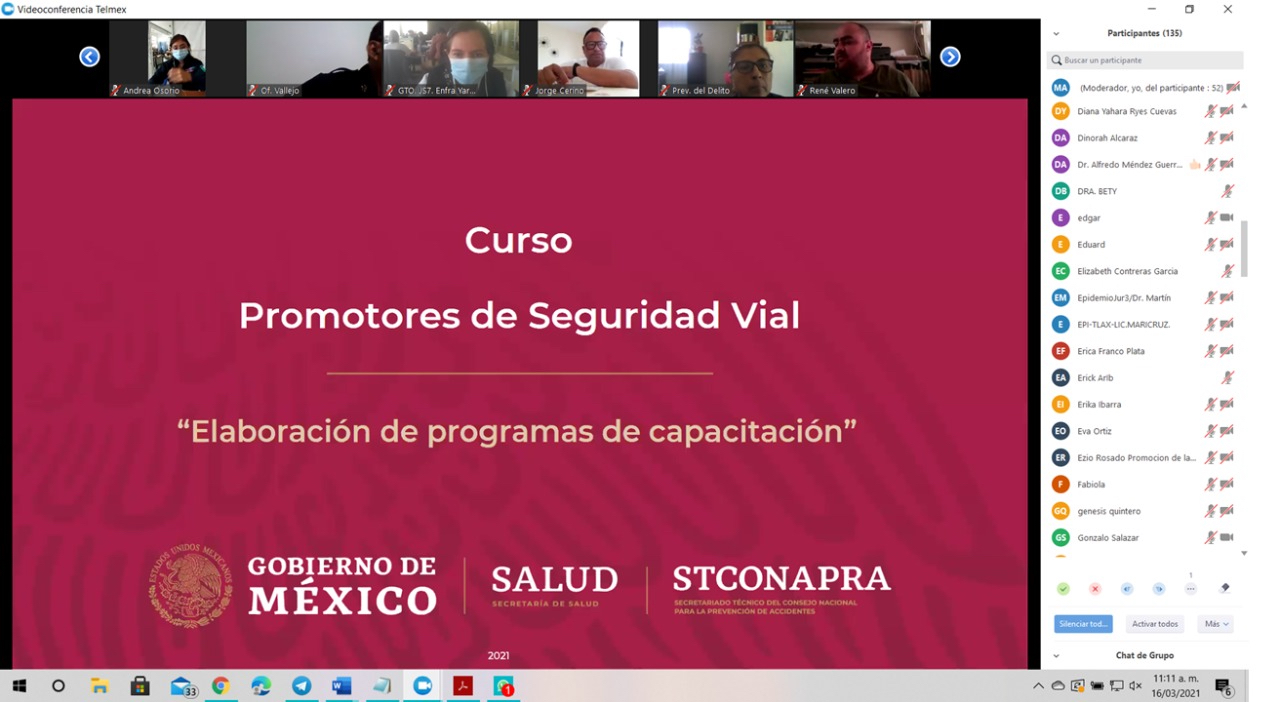 Detalló que el curso, que inició el día 16 y concluirá el 19 de marzo, se realiza en coordinación con el Secretariado Técnico del Consejo Nacional para la Prevención de Accidentes (STCONAPRA) y cuenta con la participación de 147 personas, entre servidores públicos afines del tema, profesionales de la salud, elementos de tránsito, promotores de la salud y público en general.