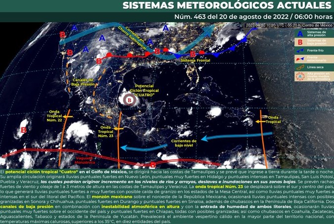 Por otro lado, dos canales de baja presión en combinación con inestabilidad atmosférica en altura y con la entrada de humedad de ambos litorales, ocasionarán lluvias puntuales muy fuertes sobre el occidente del país y puntuales fuertes en Chiapas, todas con posibles granizadas; así como chubascos en Coahuila, Zacatecas, Aguascalientes, Tabasco y estados de la Península de Yucatán.