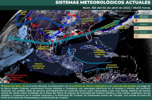 Además, el frente frío Núm. 40 se localiza en el norte del país, en interacción con la corriente en chorro subtropical y un canal de baja presión a lo largo de la Sierra Madre Oriental, ocasionarán lluvias aisladas y chubascos con descargas eléctricas en el noreste y oriente del territorio nacional.