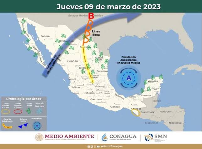 Así mismo, el ingreso de humedad del Océano Pacífico y Golfo de México, producirán lluvias aisladas y chubascos con descargas eléctricas en zonas del occidente, oriente, centro, sur y sureste de la República Mexicana, con lluvias puntuales fuertes en Chiapas.