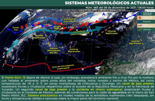 En el territorio mexicano, el frente Núm. 12 dejará de afectar al país, sin embargo, prevalecerá ambiente frío a muy frío por la mañana y heladas al amanecer sobre zonas altas del noroeste, norte, noreste y centro de México, así como temperaturas de -10 a -5 °C en zonas montañosas de Chihuahua y Durango.