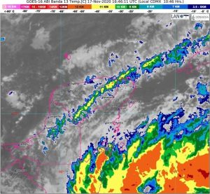 Chetumal, Q. Roo, Martes 17 de Noviembre del 2020, poderycrítica.- La amplia circulación e interacción del todavía huracán “Iota” categoría uno, con el frente frío número 13, originarán este miércoles lluvias fuertes e intensas en la Península de Yucatán.