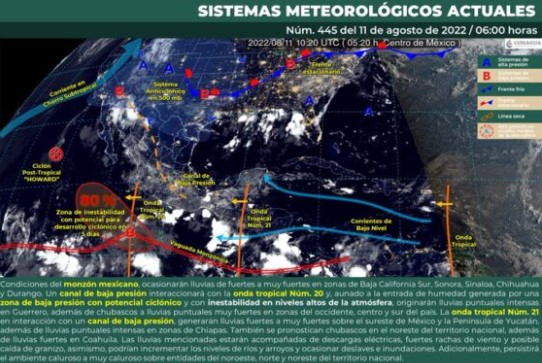 A su vez, la onda tropical Núm. 21 se desplazará sobre el sureste de México y en interacción con un canal de baja presión sobre la Península de Yucatán, generarán lluvias fuertes a muy fuertes en dichas regiones, además de lluvias puntuales intensas en zonas de Chiapas.