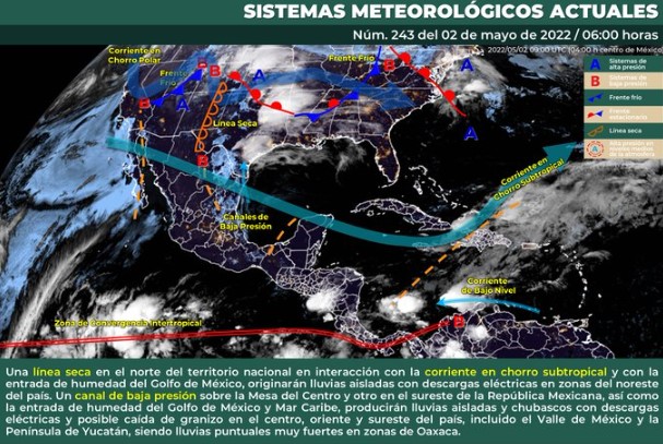 Para hoy, continuará una línea seca en el norte del territorio nacional, manteniendo interacción con la corriente en chorro subtropical y con la entrada de humedad del Golfo de México, lo que originará lluvias aisladas que podrían acompañarse de descargas eléctricas en zonas del noreste del país.