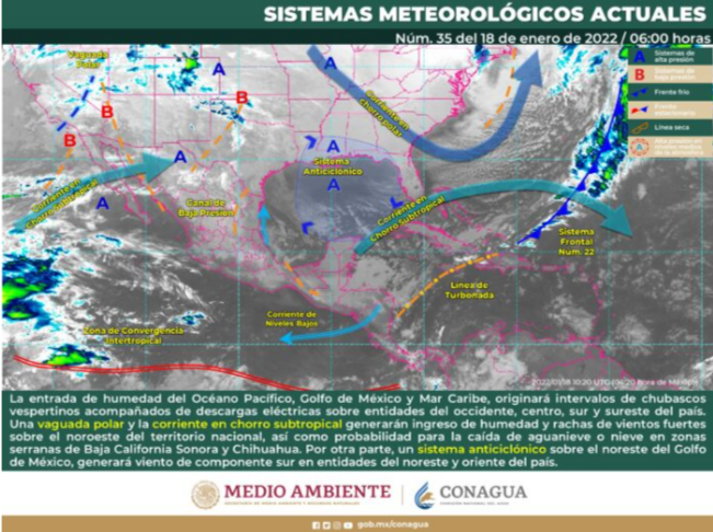 A su vez, un sistema anticiclónico sobre el noreste del Golfo de México generará viento de componente sur en entidades del noreste y oriente del país. Así como niebla en municipios del Oriente del Estado.