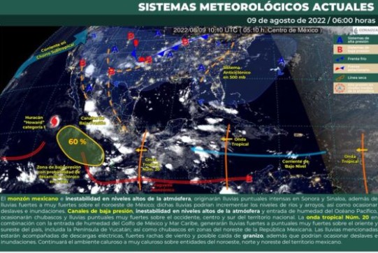 La onda tropical Núm. 20 se desplazará sobre el sureste, centro y sur de la República Mexicana y en combinación con la entrada de humedad del Golfo de México y Mar Caribe, generarán lluvias fuertes a puntuales muy fuertes sobre el oriente y sureste del país, incluida la Península de Yucatán; así como chubascos en zonas del noreste.