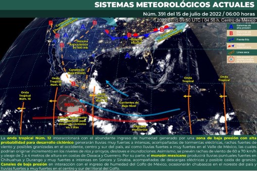 Canales de baja presión en el interior del país y su interacción con el ingreso de humedad del Golfo de México, ocasionarán chubascos en el noreste del país y lluvias fuertes a muy fuertes en el centro y sur del litoral del Golfo.