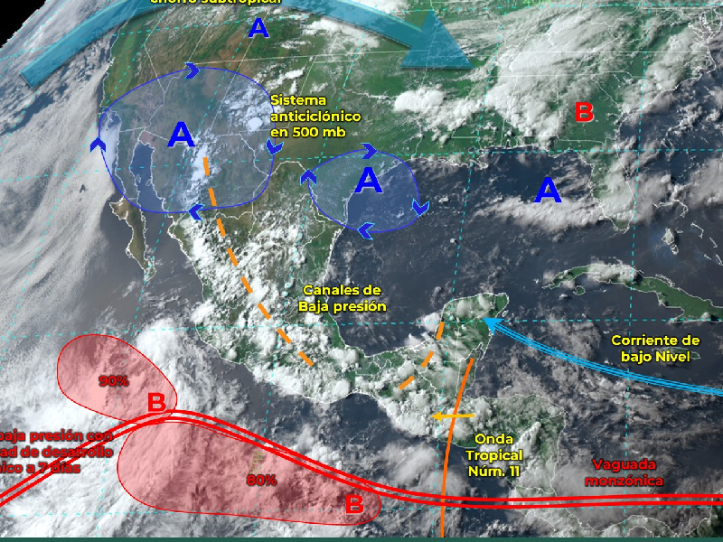 Por otro lado, la onda tropical Núm. 11 se desplazará lentamente sobre el sureste mexicano continuará interactuando con una zona de baja presión con probabilidad de desarrollo ciclónico que se ubicará al sur de las costas de Chiapas y Oaxaca, dichos sistemas generarán lluvias fuertes a muy fuertes acompañadas de descargas eléctricas y rachas de viento en dicha Península de Yucatán, así como en el oriente, sur y sureste del país, pronosticándose lluvias puntuales intensas en zonas de Chiapas, Oaxaca y Guerrero.