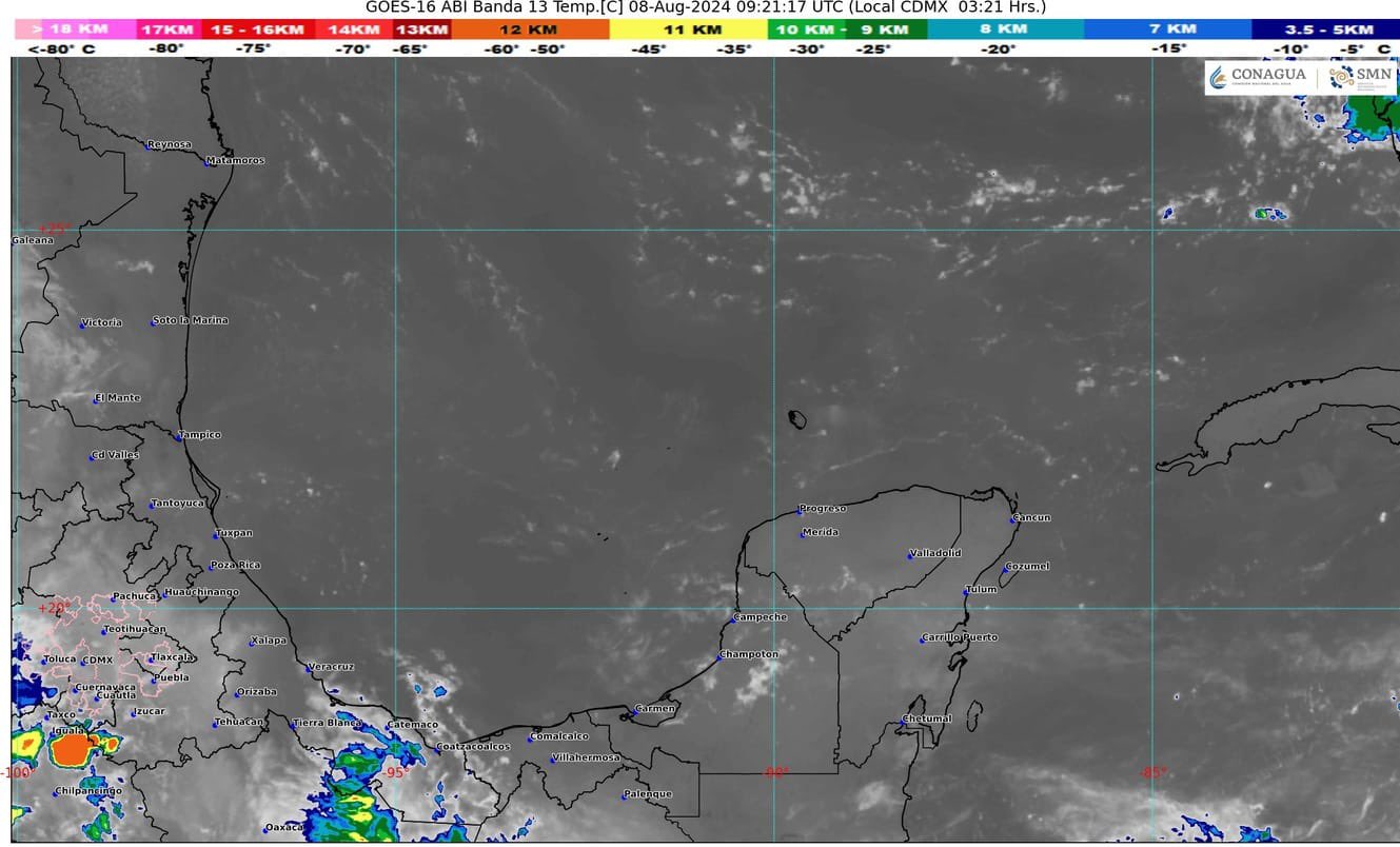 Durante la tarde ambiente caluroso, y muy caluroso en zonas de Campeche y Yucatán. Cielo nublado con lluvias puntuales fuertes y descargas eléctricas en Campeche, Yucatán y Quintana Roo, las cuales podrían generar encharcamientos o inundaciones.