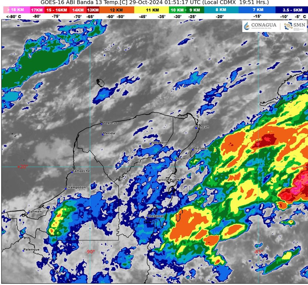 Así mismo, para la Península de Yucatán habrá cielo medio nublado en el transcurso del día; por la mañana, ambiente cálido en la región; por la tarde, ambiente caluroso, con probabilidad de lluvias puntuales muy fuertes en Quintana Roo y puntuales fuertes en Yucatán y Campeche, todas con posibles descargas eléctricas, las cuales podrían originar inundaciones y encharcamientos. Viento de dirección variable con rachas de 40 a 60 km/h en costas de la región.