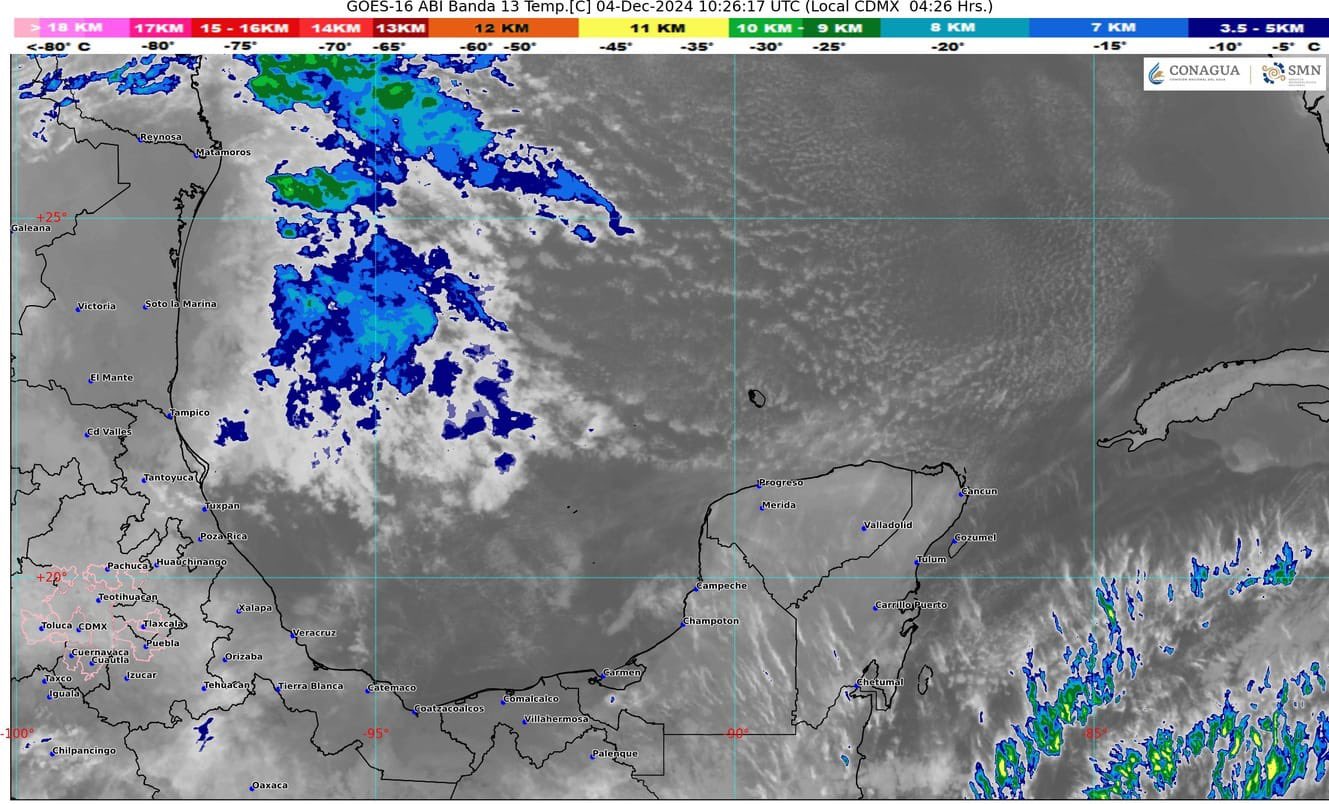 Cielo medio nublado a nublado durante el día con chubascos en Tamaulipas y Veracruz. Sin lluvia en Tabasco. Bancos de niebla en la región.