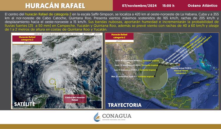 En estos momentos, el huracán «Rafael» se localiza al noroeste de Cuba, a aproximadamente 350 kilómetros al noreste de Cabo Catoche, Quintana Roo, y se desplaza hacia el oeste en dirección al Golfo de México. Su aún trayectoria es incierta, con posibles destinos hacia la costa estadounidense o las áreas entre Veracruz, Tabasco y Campeche.