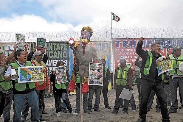 México, 03 febrero; poderycritica.-Unas 50 personas protestaron este domingo en Tijuana, en el muro fronterizo que divide a la ciudad de Baja California con la estadounidense San Diego por las políticas antiinmigrantes de la administración del presidente Donald Trump y quemaron una piñata con su figura.