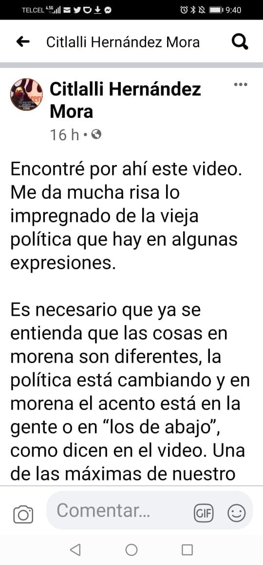 «Es necesario que ya se entienda que las cosas en Morena son diferentes, la política está cambiando y en Morena el acento está en la gente o en ‘los de abajo’, como dicen en el video», aseguró.