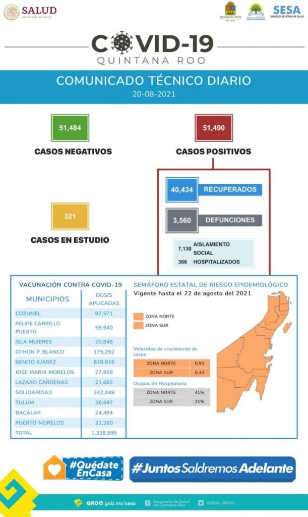 De acuerdo con el Comunicado Técnico Diario que elabora la Secretaría estatal de Salud (SESA), hasta el 20 de agosto se han registrado 51, 490 casos positivos en Quintana Roo, 3,560 decesos y se aplicaron 1 millón 338 mil, 995 dosis de vacunas contra COVID-19.