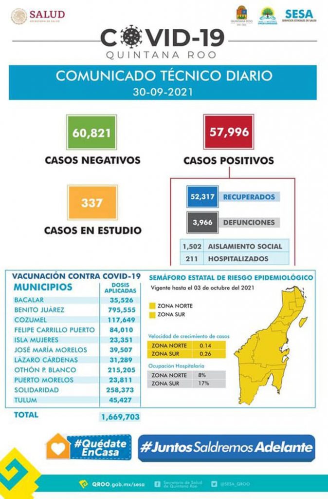 Cancún, Q. Roo, Jueves 30  de Septiembre de 2021, poderycrítica.-  Quintana Roo cierra el mes cerca de alcanzar los 58,000 casos positivos de COVID-19, los 4,000 decesos y más de 1.6 millones de vacunas.