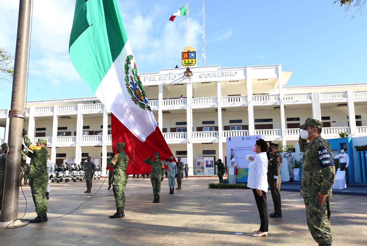 Chetumal, Q. Roo, Miércoles 24 de Febrero de 2021, poderycrítica.- El Gobierno del Estado de Quintana Roo conmemoró hoy, con el izamiento del pabellón en el asta monumental, el segundo centenario de la bandera nacional, en un evento cívico que tuvo lugar en la explanada frente al Palacio de Gobierno.