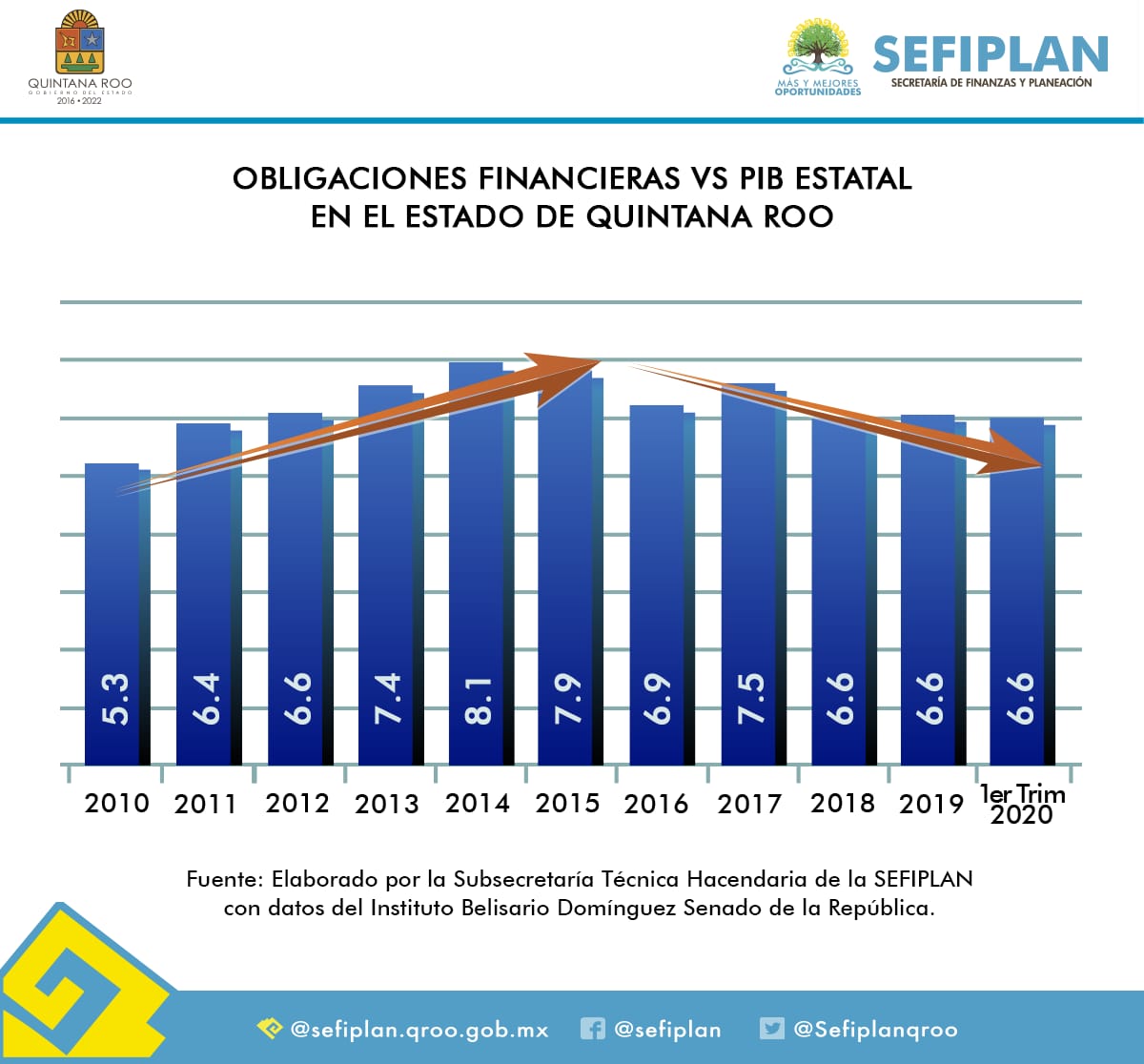La titular de la Secretaría de Finanzas y Planeación (SEFIPLAN), Dra. Yohanet Torres Muñoz, señaló que “En la última publicación del reporte trimestral se observa que la relación de Deuda Estatal entre PIB, llamado Apalancamiento Financiero; se muestra una clara estabilidad, por la reducción paulatina desde 2015 cuando la Deuda Pública era equivalente al 7.9% del PIB, hasta el 6.6% obtenido del 2018 y que se ha mantenido controlada en esa proporción hasta el primer trimestre de 2020”.
