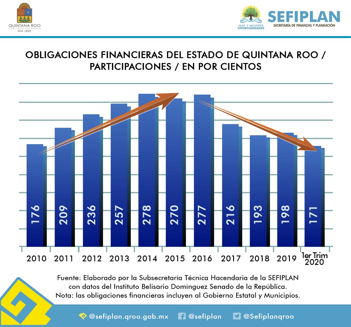 La titular de la SEFIPLAN explicó que “Las obligaciones financieras del Estado se atienden con recursos de libre disposición, principalmente con recursos obtenidos por el rubro de participaciones federales que utiliza como garantía de pago, en ese sentido el indicador de las obligaciones financieras como proporción de las participaciones es un indicador apropiado para medir la capacidad del Gobierno del Estado de cumplir con esos compromisos de pago adquiridos”.