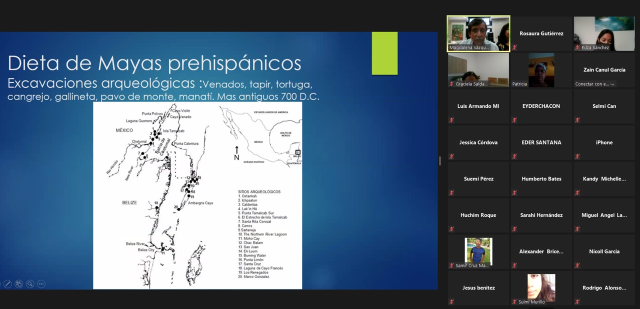 Guillermo Velázquez destacó que, en los lugares donde los mayas prehispánicos tiraban sus desechos, se han encontrado huesos de venado, tapir, tortuga, cangrejos, gallina, pavo de monte y de manatíes, mostrando que formaban parte de su dieta, también hay registros de reportes arqueológicos de canoas pequeñas esculpidas en hueso de manatíes.