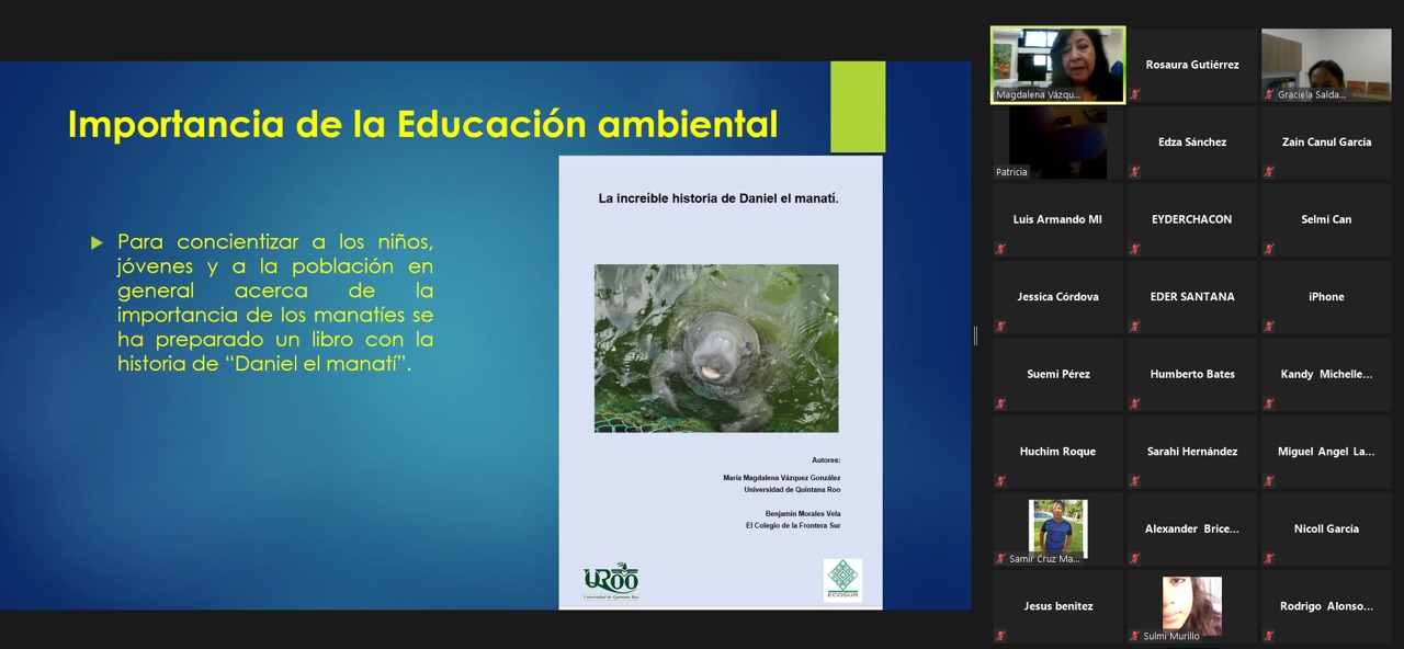 La investigadora Magdalena Vázquez enfatizó la importancia de educar para conocer, conservar y preservar a los manatíes cuidando su hábitat. En próximas fechas presentará de manera digital el libro “El manglar y sus tesoros escondidos”, y se espera que para el siguiente año se presente durante la Semana Estatal del Manatí el libro: “La historia de Daniel el manatí” (en colaboración con el doctor Benjamín Morales).
