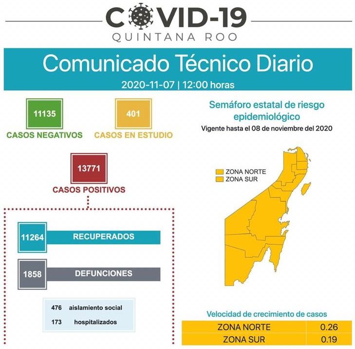 Chetumal, Q. Roo, domingo 07 de noviembre de 2020, poderycrítica.- De los 13,771 casos positivos que se han registrado de coronavirus en Quintana Roo, 1858 personas han perdido la vida.