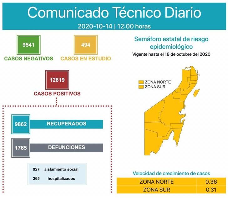 Chetumal, Q. Roo, Miércoles 14 de Octubre del 2020, poderycrítica.- Ya son 12,819 casos positivos por COVID-19 en el estado, de los cuales 1765 personas han perdido la vida.