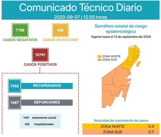 Cancún, Q. Roo, Lunes 07 de Septiembre de 2020, poderycrítica.- De las 10,700 91 personas que se han contagiado por Covit 19, 1467 personas han perdido la vida por este mal en Quintana Roo.