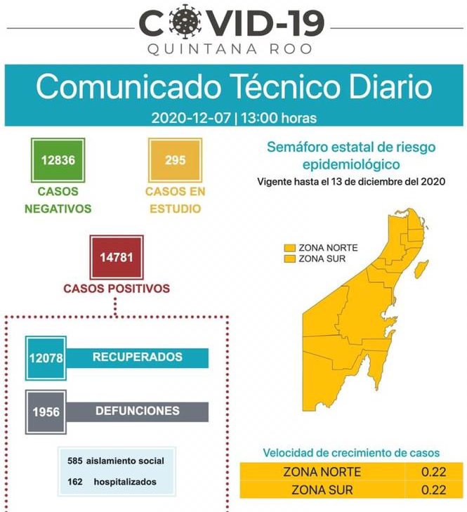 Chetumal, Q. Roo, Lunes 07 de Diciembre de 2020, poderycrítica.- De los 14,781 casos positivos que se han registrado por coronavirus en Quintana Roo, han muerto 1956 personas por este mal.