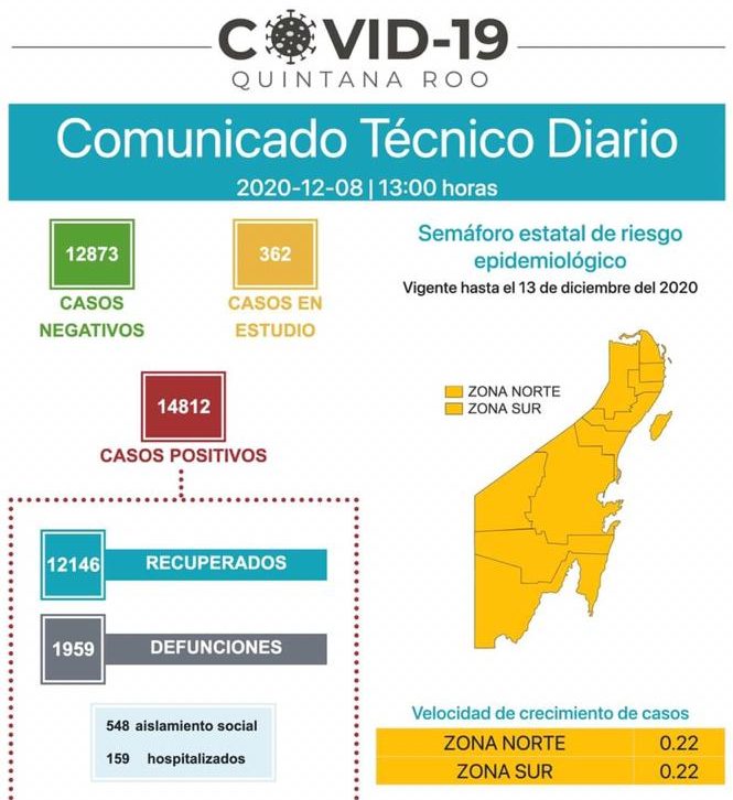 Chetumal, Q. Roo, martes 08 de Diciembre de 2020, poderycrítica.- En lo que va de la pandemia se han confirmado 14,812 casos positivos de los que 1959 perdieron la vida por este mal.