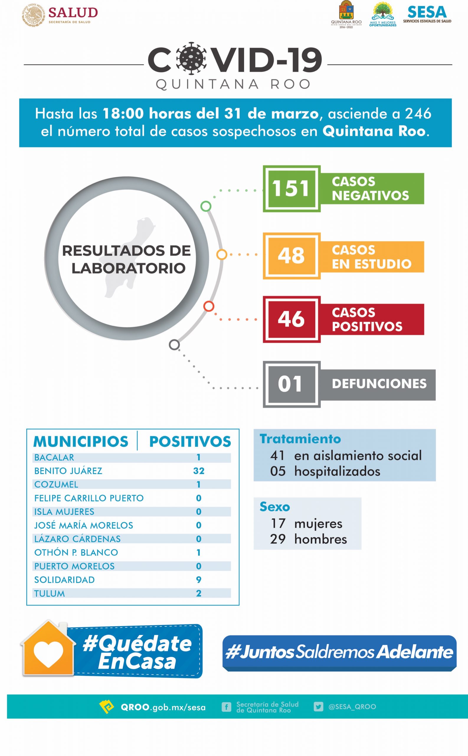 En su reporte vespertino del martes 31 de marzo, la Secretaría de Salud informó que los municipios que siguen sin casos son Isla Mujeres, Felipe Carrillo Puerto, Puerto Morelos, Lázaro Cárdenas y José María Morelos.