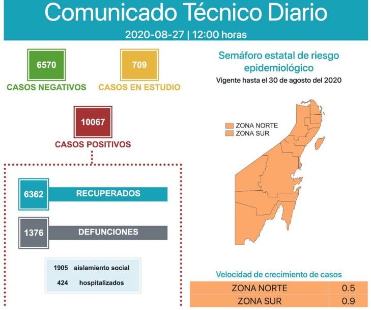 Cancún, Q. Roo, Jueves 27 de Agosto de 2020, poderycrítica.- La Secretaría de Salud en Quintana Roo registró 73 nuevos casos de Covid-19 en las últimas 24 horas del día de hoy 27 de agosto, así como 16 de funciones relacionadas a la misma enfermedad.