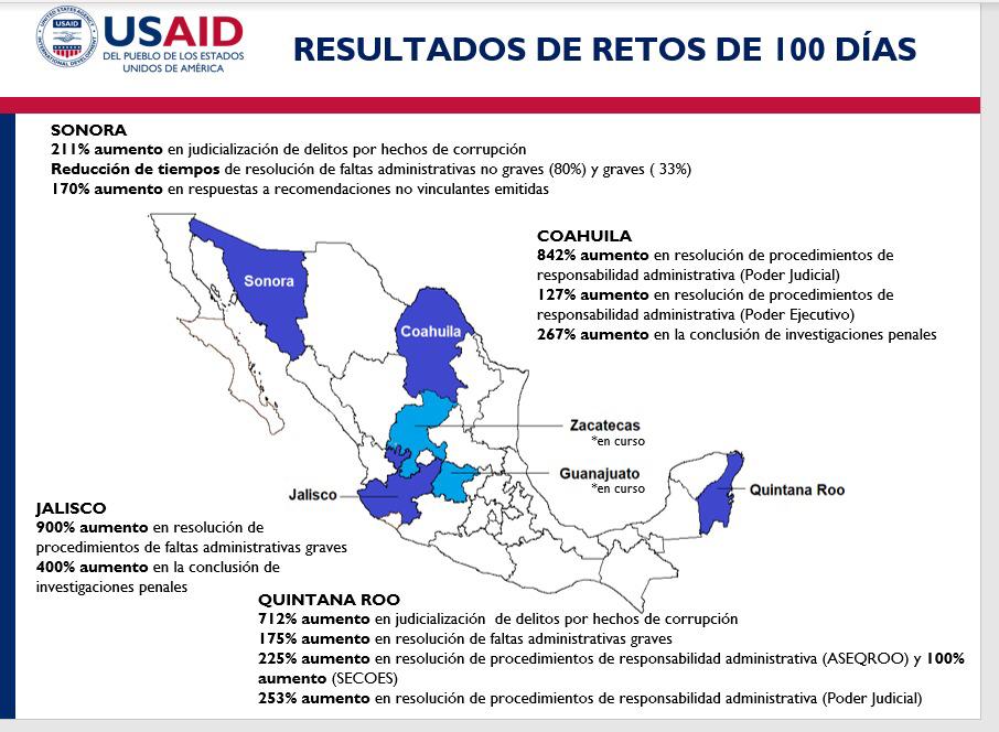 Rosaura Villanueva Arzapalo Fiscal Anticorrupción confirmó que el reto fue superado con éxito, tratándose de una dinámica en la que participaron diferentes entidades federativas, a través del financiamiento de Agencia de los Estados Unidos para el Desarrollo Internacional (USAID), bajo la metodología del Instituto de Resultados Rápidos (RRI).