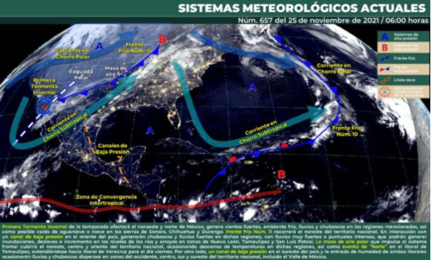 Así mismo, en el resto del país, la Primera Tormenta Invernal de la temporada afectará el noroeste y norte de México, generando vientos fuertes, ambiente frío, lluvias y chubascos en las regiones mencionadas, así como posible caída de aguanieve o nieve en las sierras de Sonora, Chihuahua y Durango.