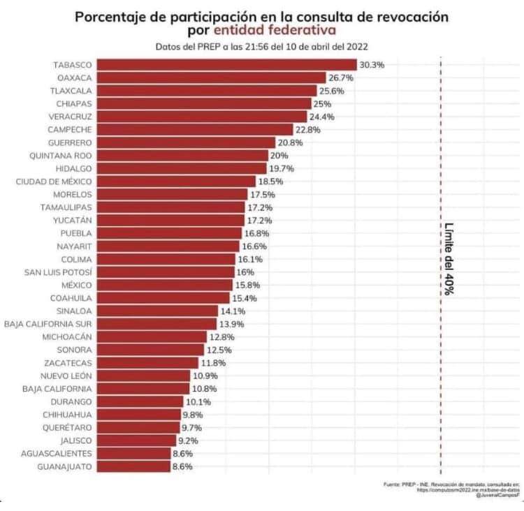 PODER Y CRÍTICA | SAMUEL CAAMAL | El estado de Quintana Roo se ubicó entre las diez entidades del país que más votos se obtuvieron durante el proceso de revocación de mandato. El primer sitio lo obtuvo el estado de Tabasco que logró una participación del 30.3%, le siguió el estado de Oaxaca con el 27.6 por ciento, luego Tlaxcala con el 25.6 por ciento, el el siguiente sitio se ubicó el estado de Chiapas con un 25%, posteriormente el estado de Veracruz con el 24.4 por ciento, el estado de Campeche logró un 22.8 de participación, mientras que Guerrero llegó al 20.8% y mientras que Quintana Roo logró un 20 por ciento de participación.