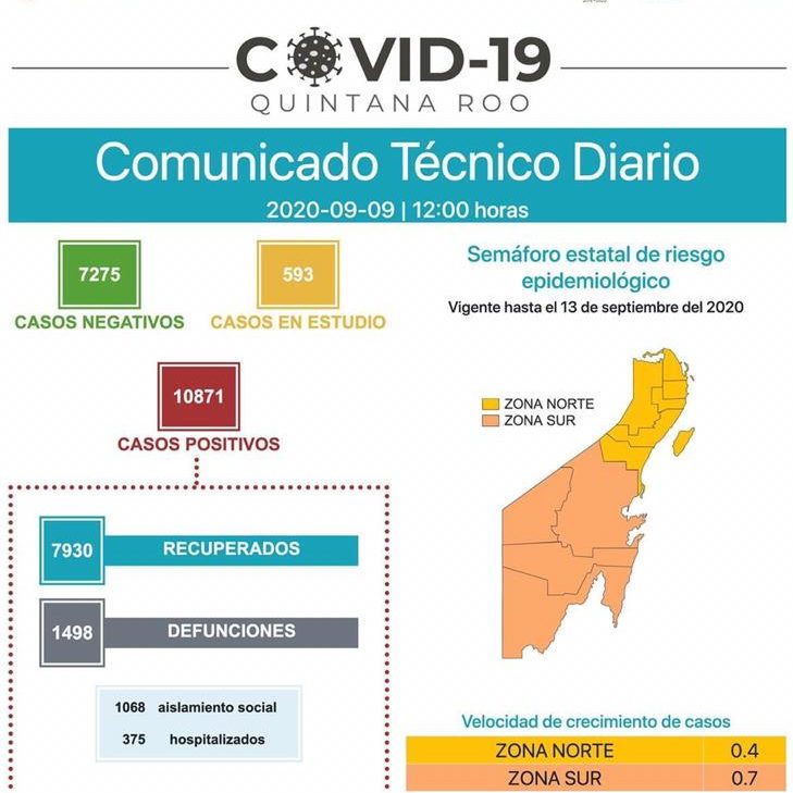 Cancún, Q. Roo, Miércoles 09 de Septiembre de 2020, poderycrítica.- De acuerdo al comunicado técnico emitido por la Secretaría de salud, son 10,871 casos positivos en lo que va de la pandemia del coronavirus, 1498 personas han perdido la vida, 7930 se han recuperado y 593 personas se encuentran bajo estudio.